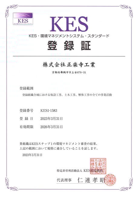 「KES」は、Kyoto Enviromental Management System Standard の略で国際規格の「ISO14001」や環境省が策定する「エコアクション21(EA21)」と同じ、自然環境と共生し、循環型社会システムを構築してゆくための、実現可能な取り組み手法として考案された環境マネジメントシステム(EMS)の認証規格のひとつです。