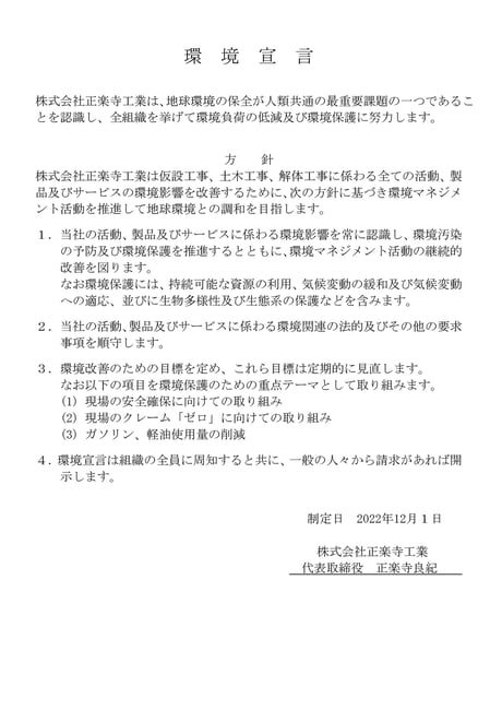 当社は登録組織全域における仮設工事、土木工事、解体工事の全ての事業活動を通じ、地球環境の保全が人類共通の最重要課題の一つであることを認識し、全組織を挙げて環境負荷の低減及び環境保護に努力します。